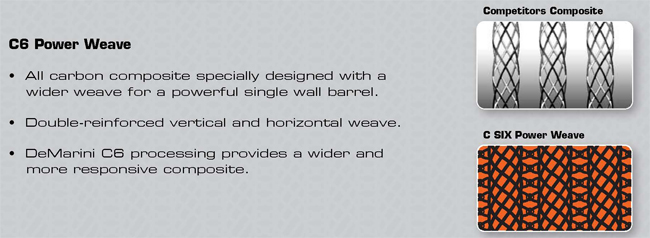 The C6 Power Weave of all carbon is specially designed with a wider weave and powerful singlewall barrel. The double reinforced vertical and horizontal weave is what provides the more responsive composite design you have been looking for.