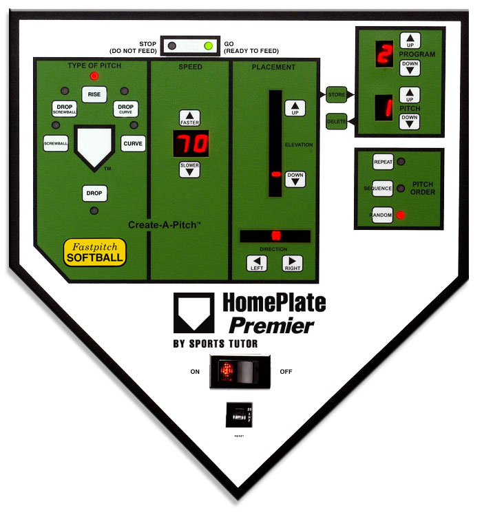 The Homeplate Premier machine can automatically throw 70 mph riser, 35mph change-up, drop curves, curves, screwballs, drop screws, drops and everything in between.
